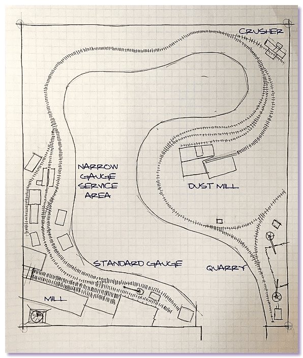 Before, my layout was like a narrow gauge version of the Nelson & Albemarle Railroad. Now, it is a more “typical” quarry operation. The layout used to run into the shop and office for operational reasons. As my interest in operation cooled, I considered how I could remove those two sections and still have a nice layout in a nice space. Fortunately, I only have to make a few track revisions and no benchwork revisions in the layout room in order to pursue this new idea.